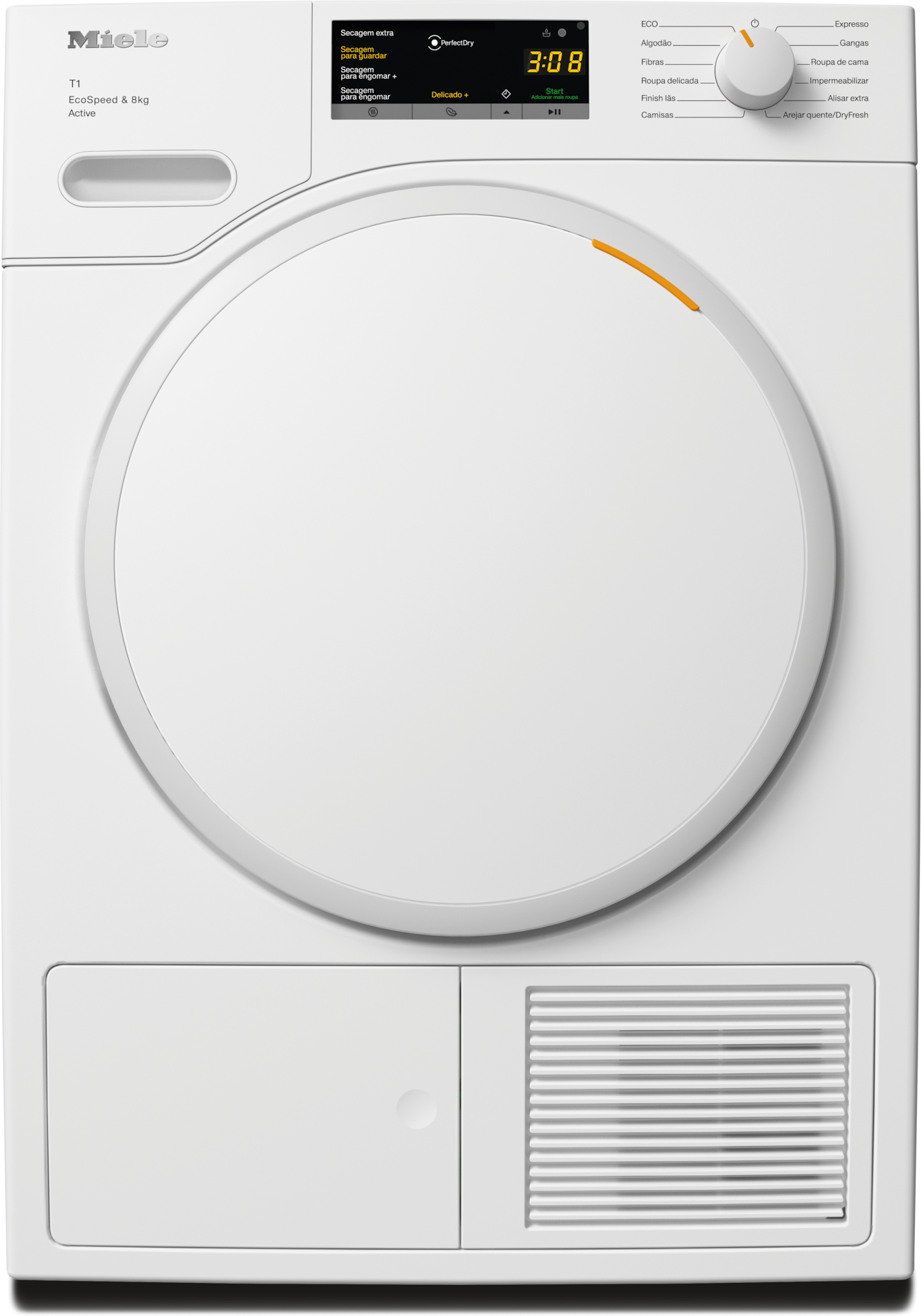 - 5.Poupanças de tempo calculadas em comparação com máquinas de secar roupa da Miele sem EcoSpeed, com a mesma carga e eficiência energética semelhante. Testado no programa «Algodão» com uma carga total.